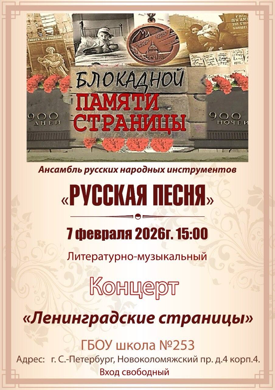 В 15:00 в актовом зале состоится литературно-музыкальный концерт «Ленинградские страницы» (ансамбль «Русская песня» и детский танцевальный коллектив «Радуга»)